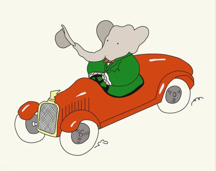 Toby’s name on the front ( on the slat across) with Barbar in his car either side, Toby and his date of birth painted in red to match Babar’s bow tie
