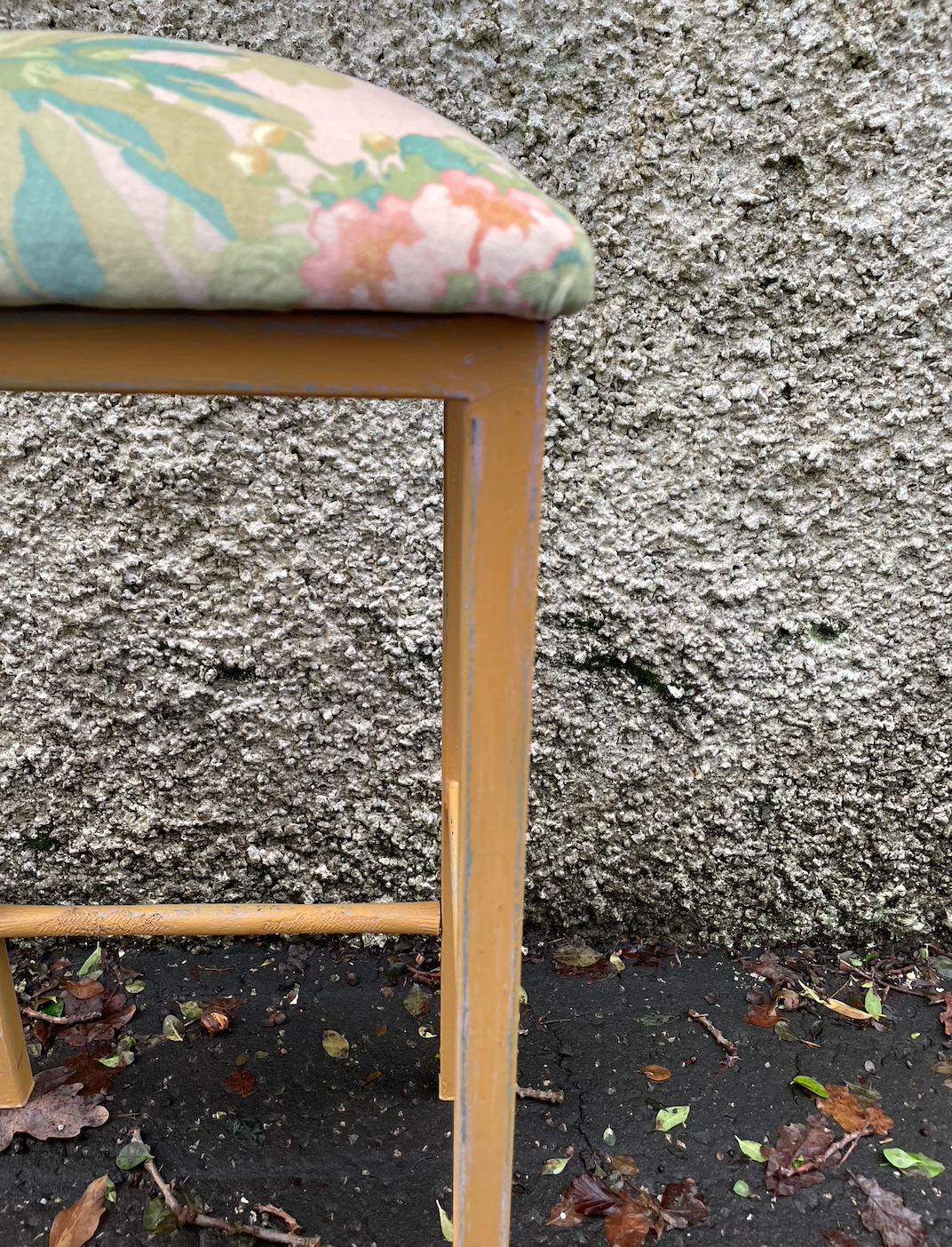 Vintage metal stool with tropical velvet seat pad . Legs have been painted in ANNIE SLOAN pink Henrietta and Gild lane Jubilee paint in oxford ochre and distressed for a vintage look. 61cm high x 27cm deep x 34cm wide.