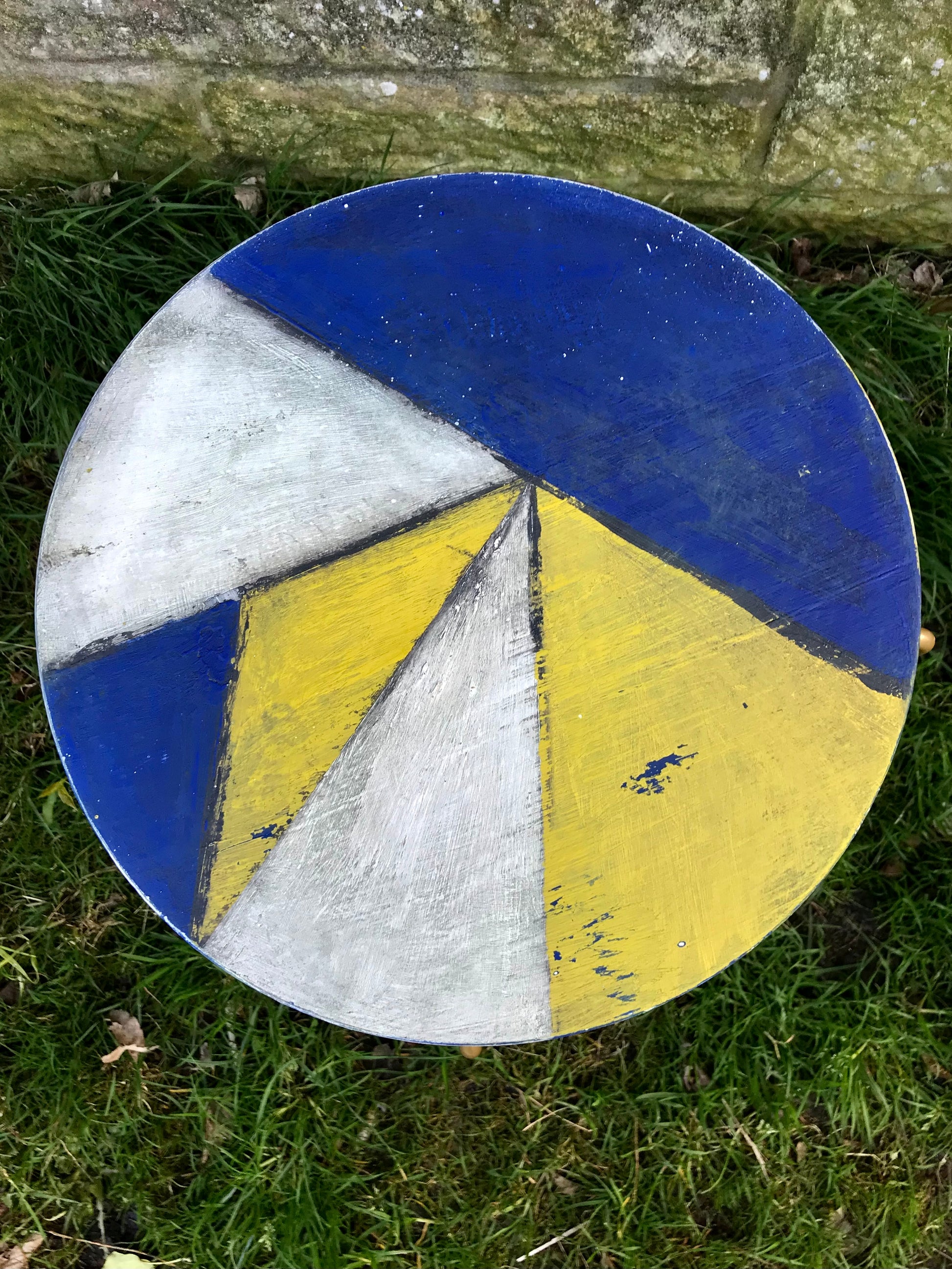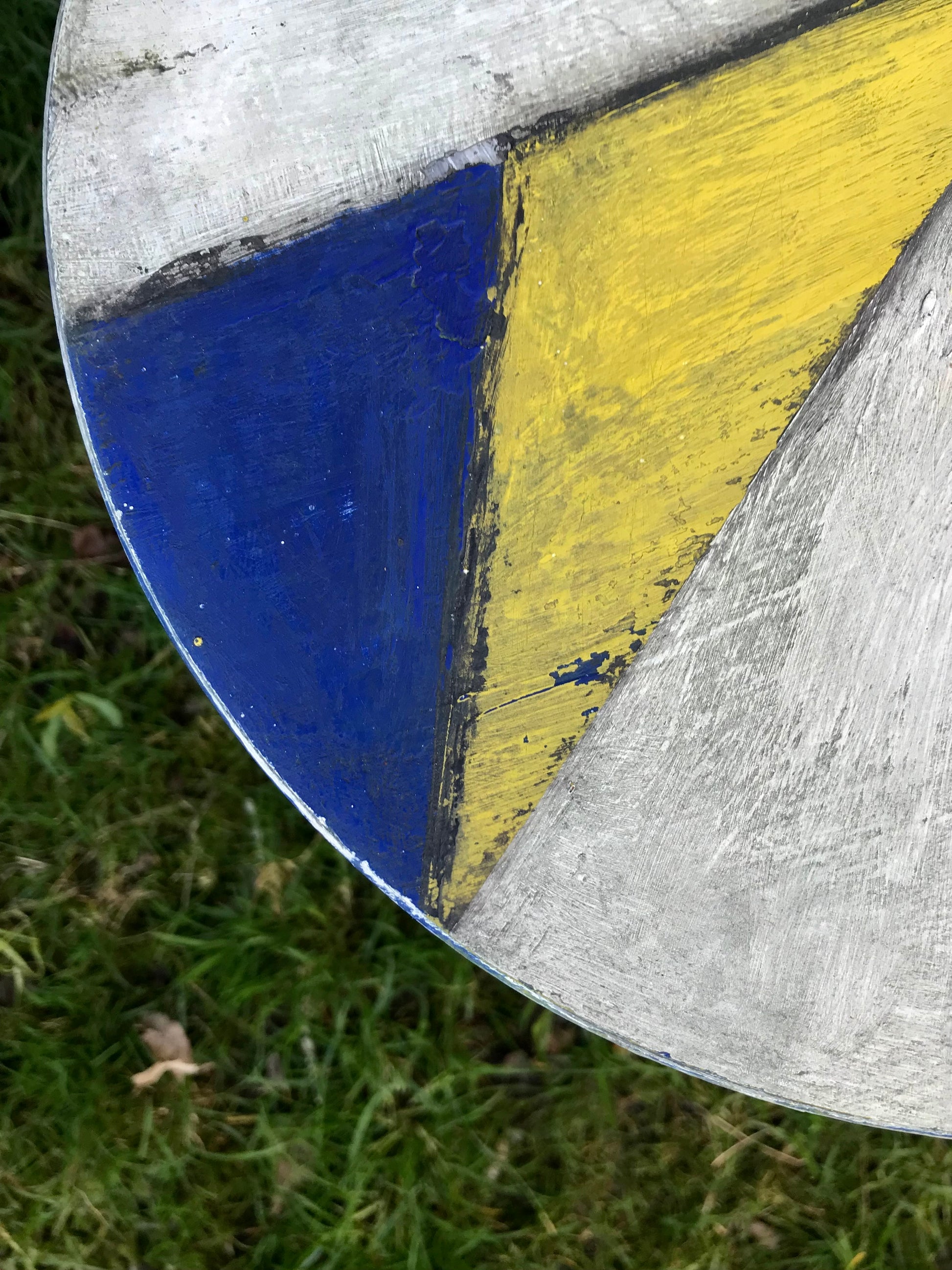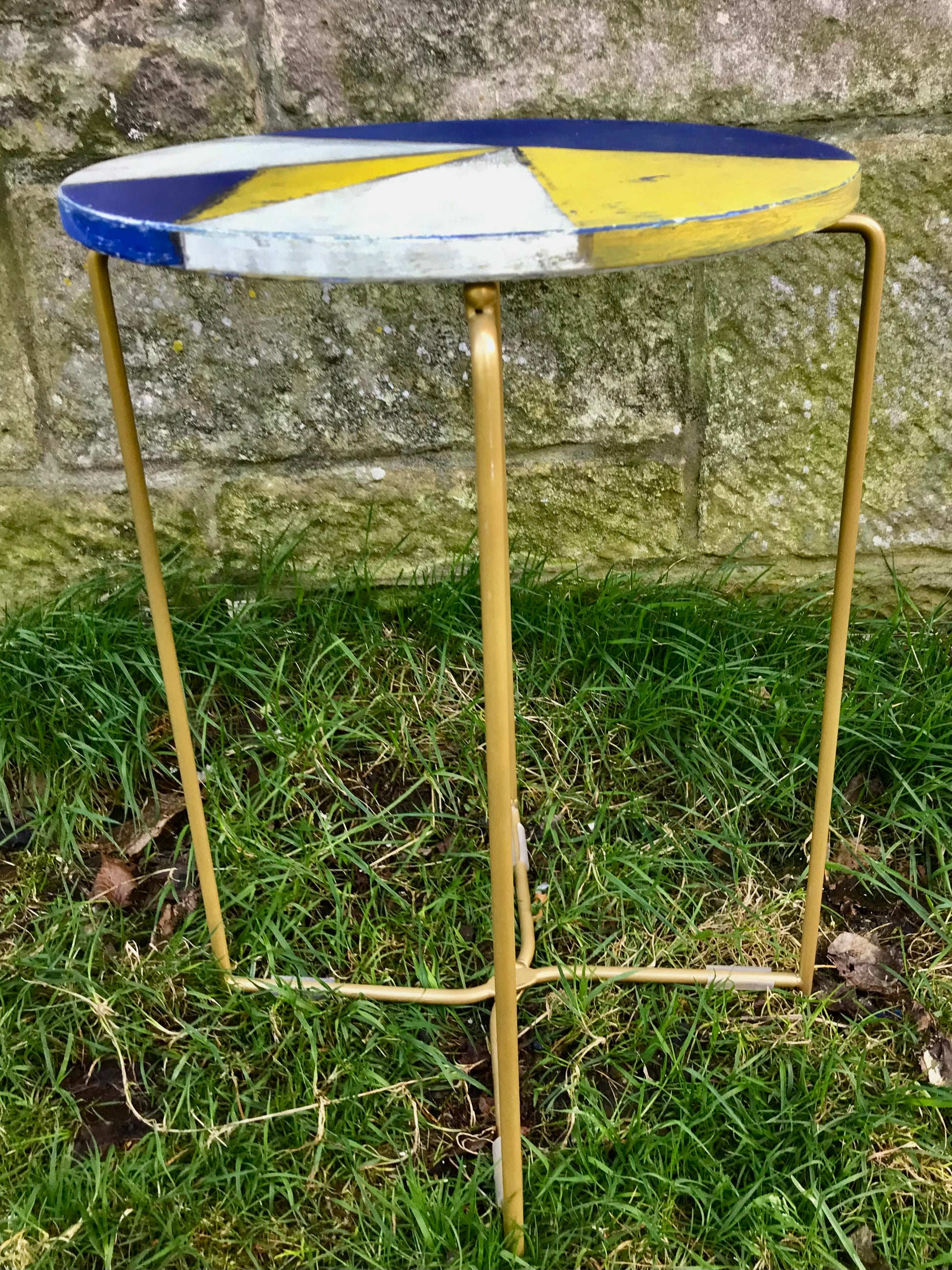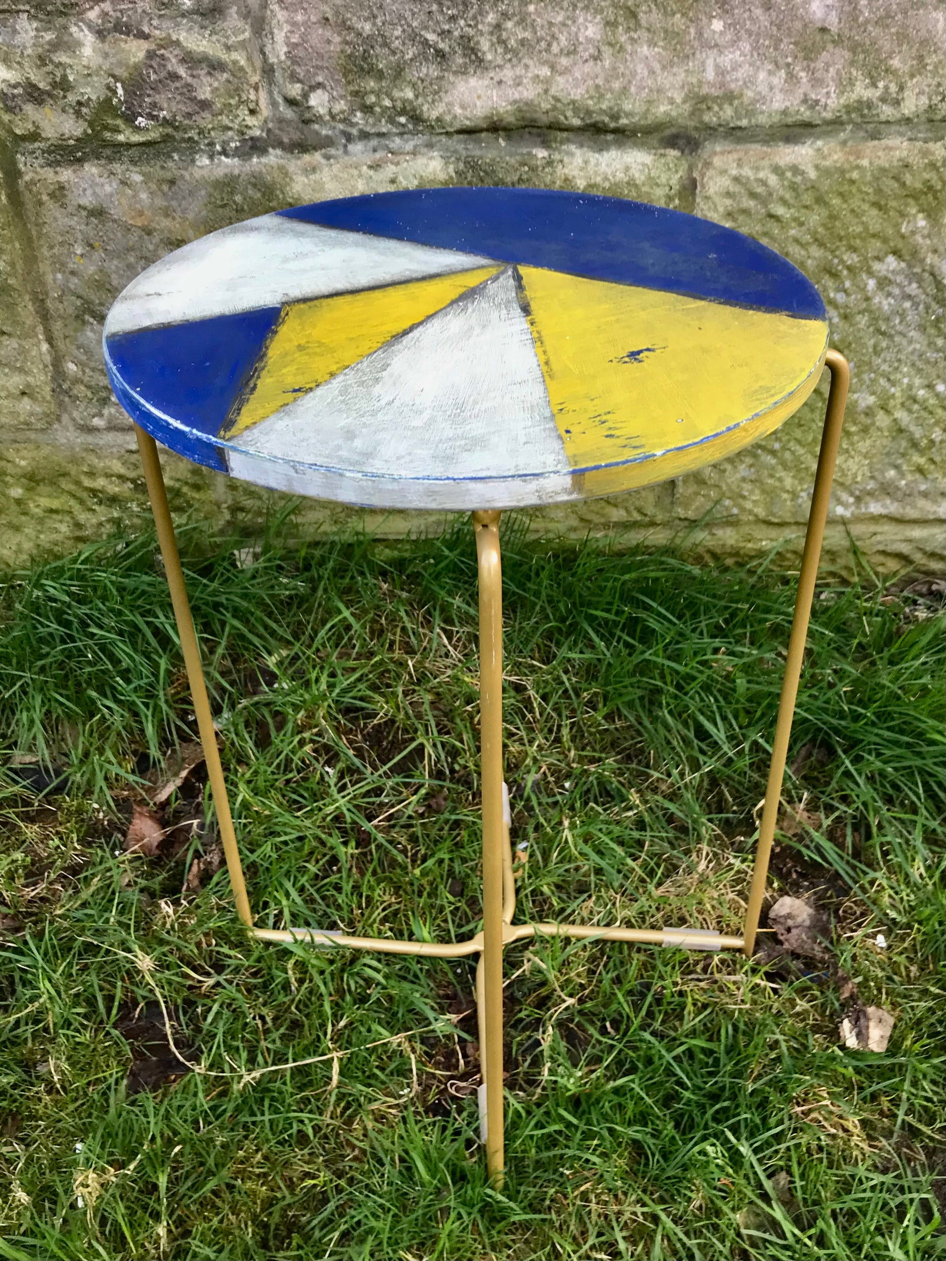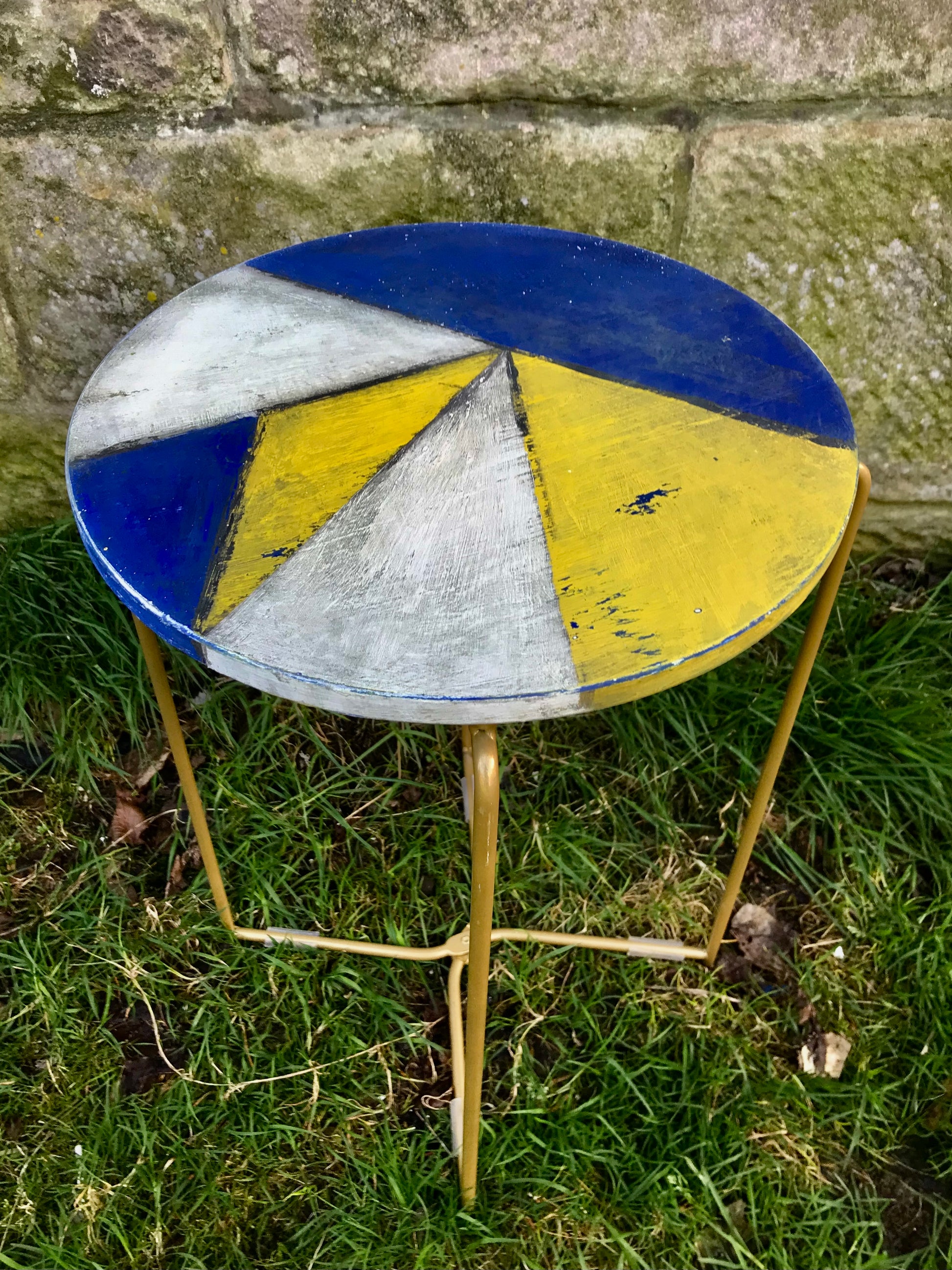 Modern marble side table painted in Annie Sloan Chalk Paint in Frida blue paired with English yellow and pure. Heavily distressed and dark waxed for an industrial look.