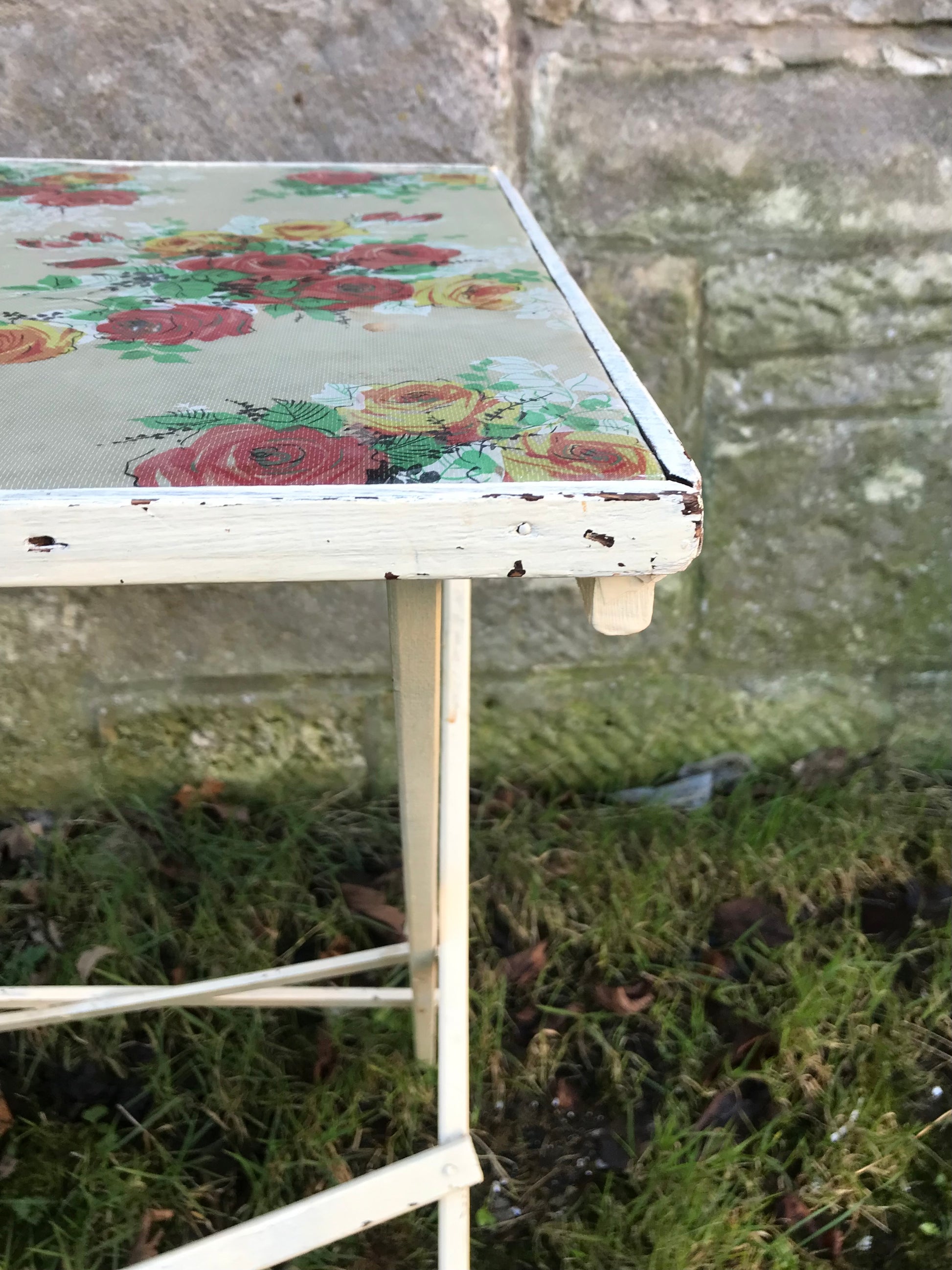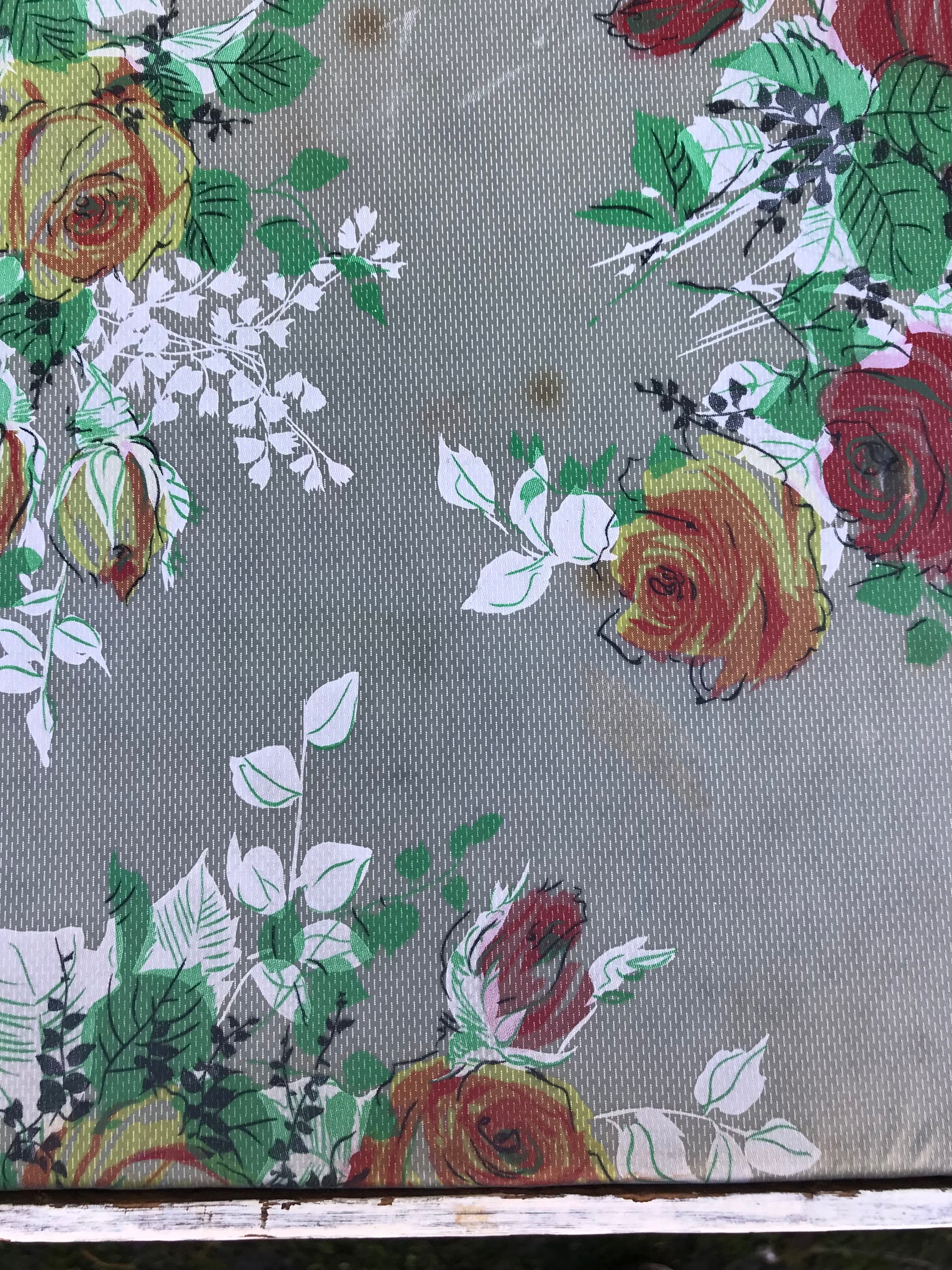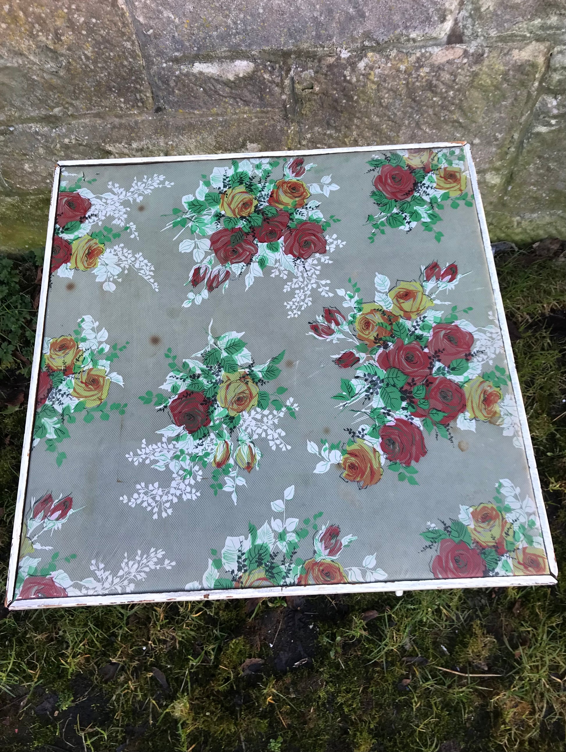 Folding 1950's table with padded floral vinyl fabric top. Some age spots on the fabric