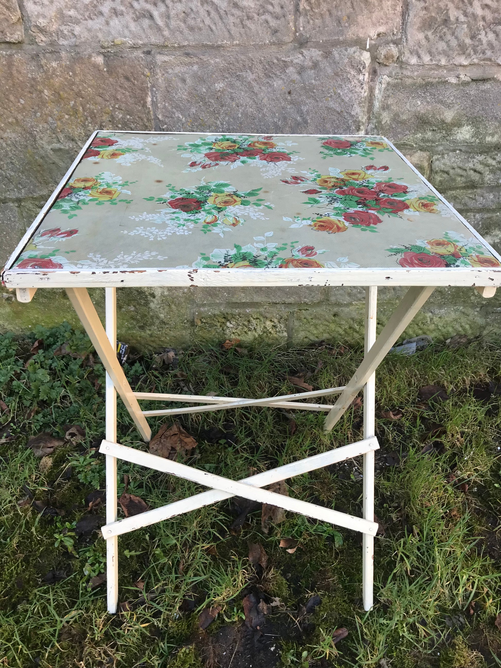 Folding 1950's table with floral padded vinyl fabric top