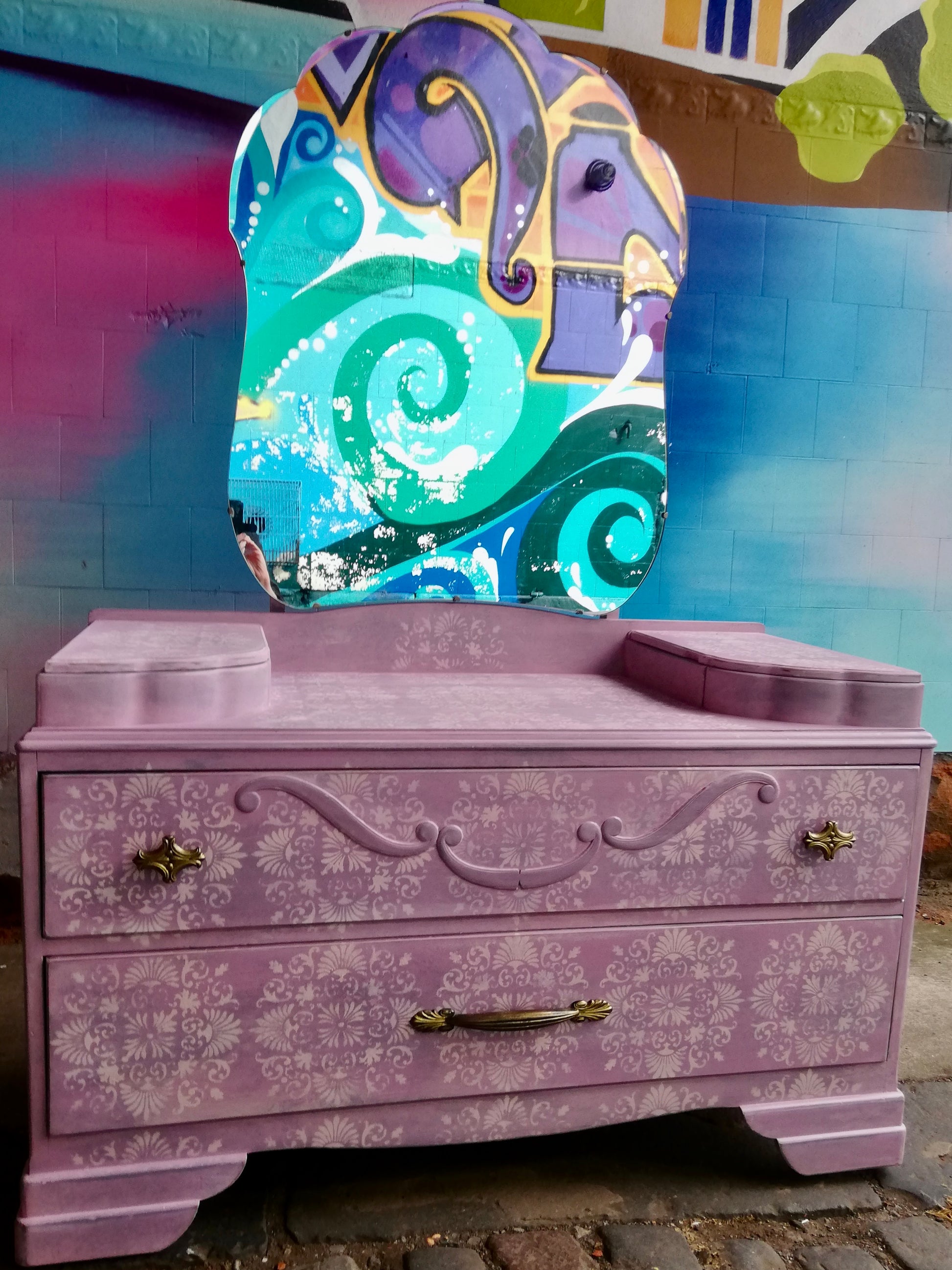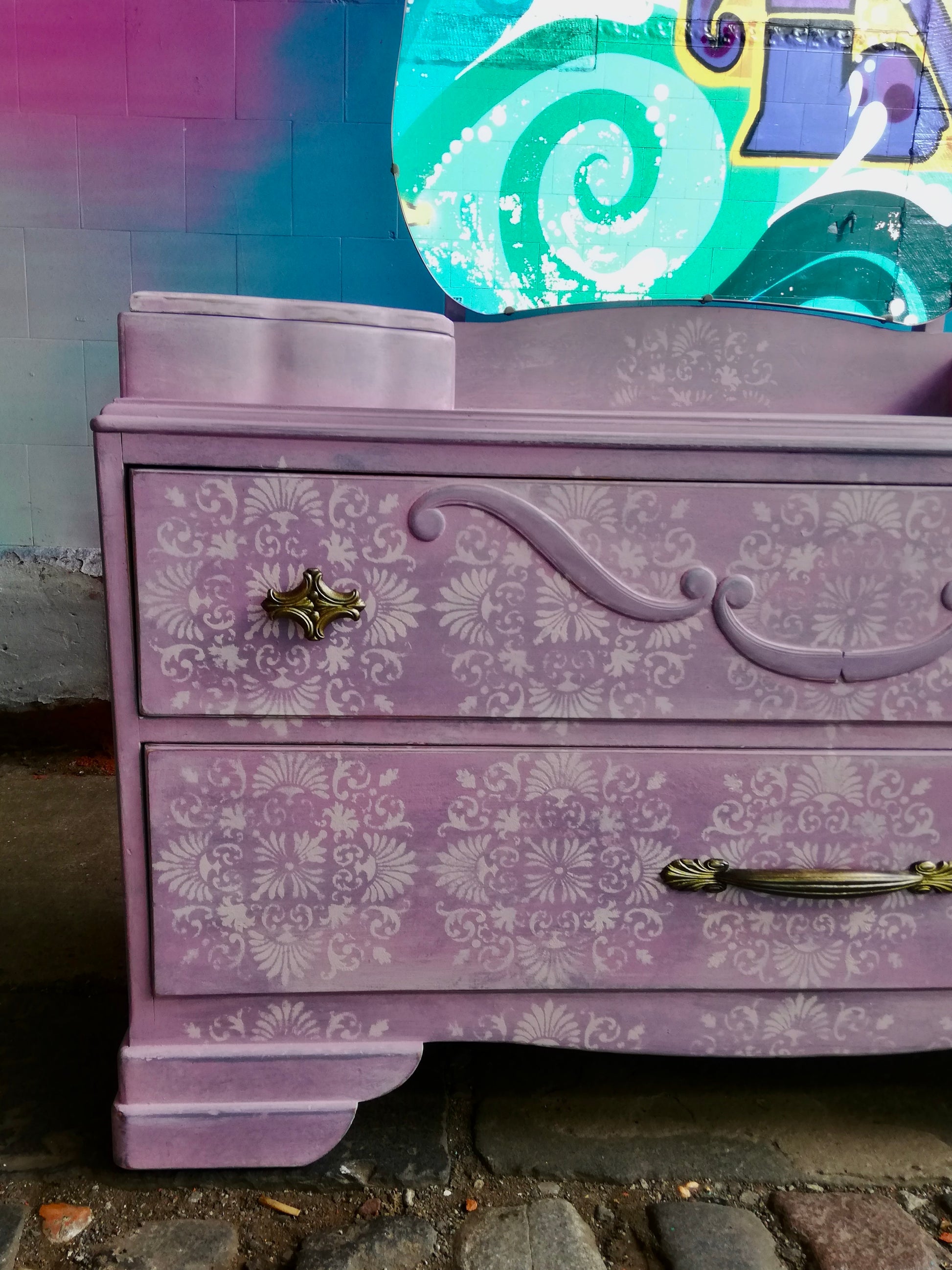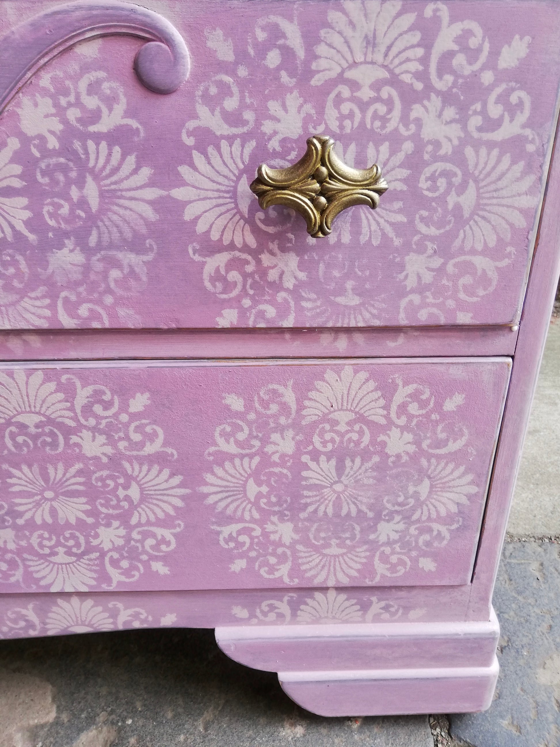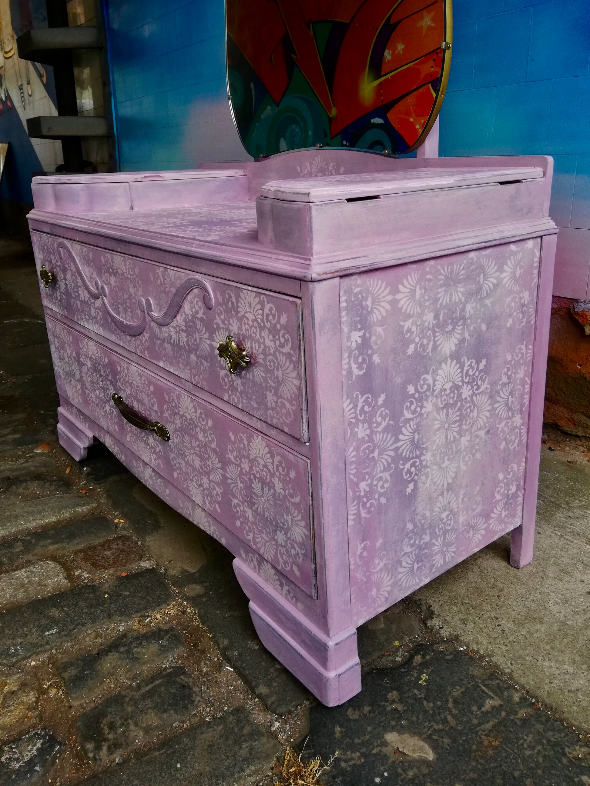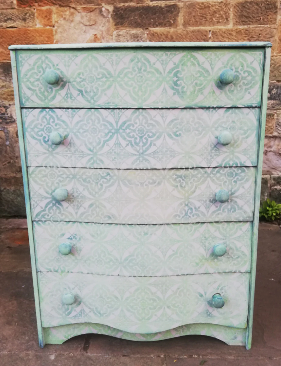 I source the furniture of your choice. The furniture is painted in washes of 3 Annie Sloan Chalk Paint colours of your choice. and stencilled all over in another Annie Sloan Chalk Paint colour or I can use metallic colour. View the colour's on Annie's site here The whole pieces is then distressed and can be antique waxed or clear varnished for protection. I have lots more stencil designs available. as well. A beautiful Boho vintage look. £295- £395 depending on the piece. Small pieces such as bedsides and coffee tables start at £100