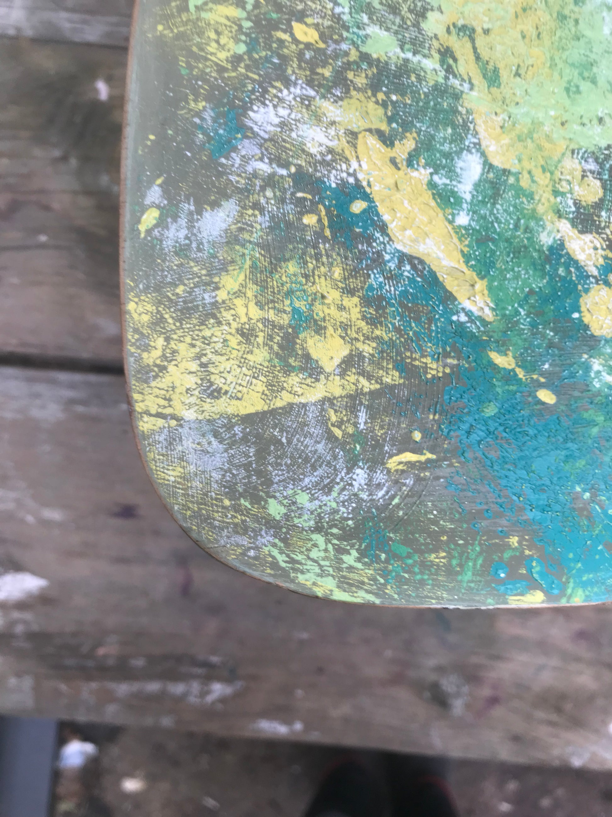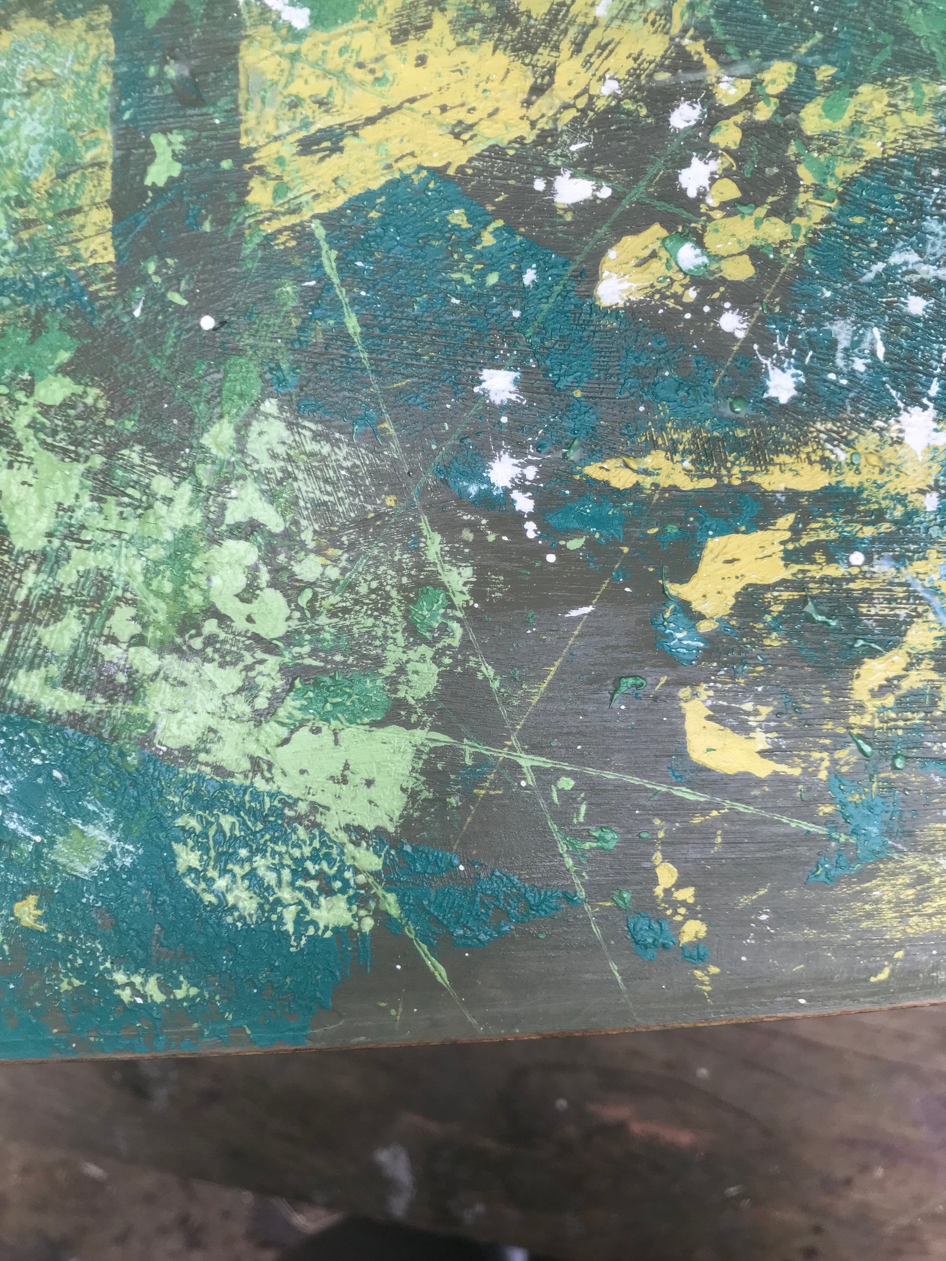 31.5cm high x 66cm wide x 36cm deep. Painted in layers of chalk paint.Legs have been stripped back to the original wood. Sealed with Matt lacquer. The top has a textured feel to the paint work. Legs are removable for easy transport and storage.
