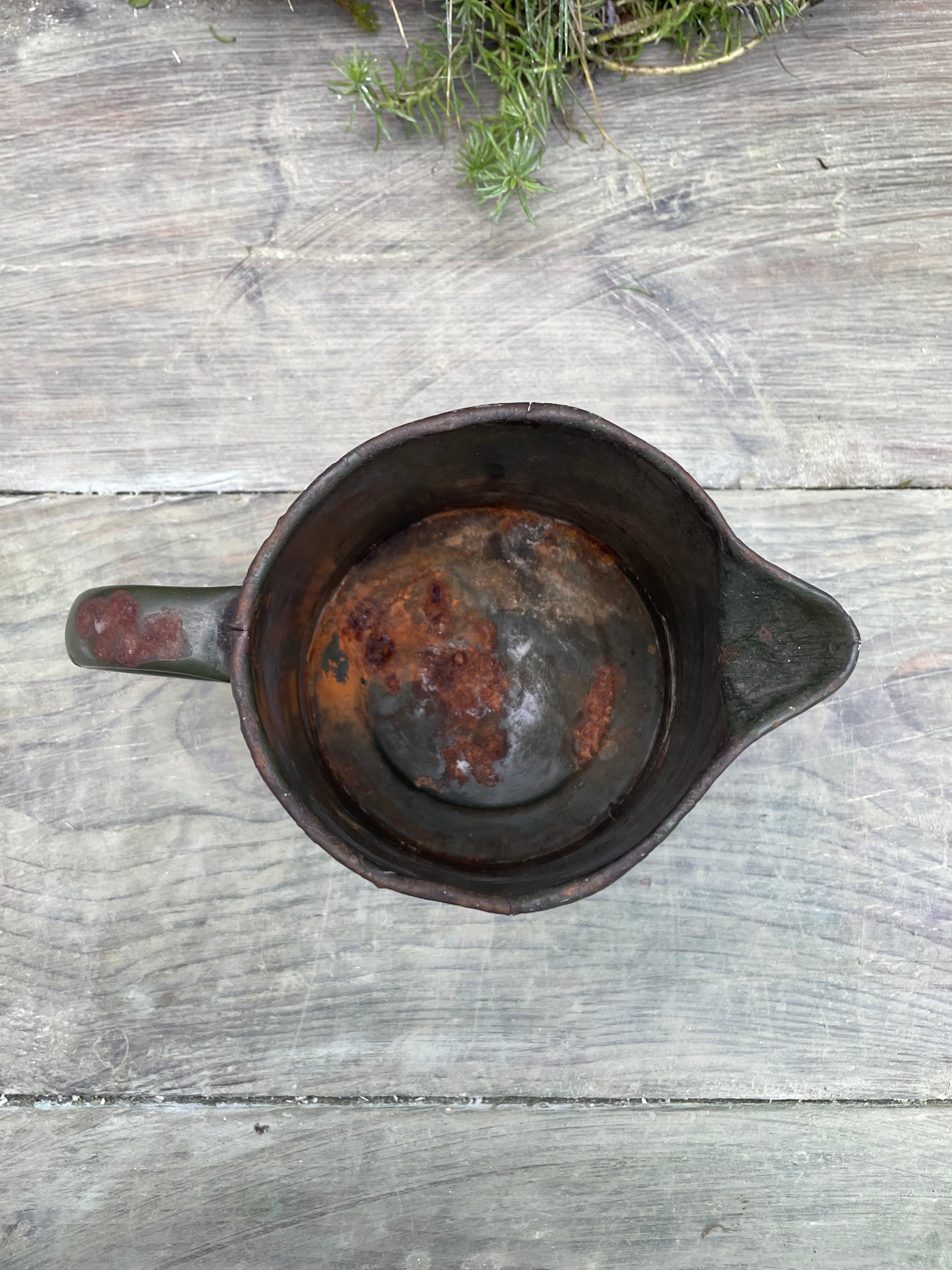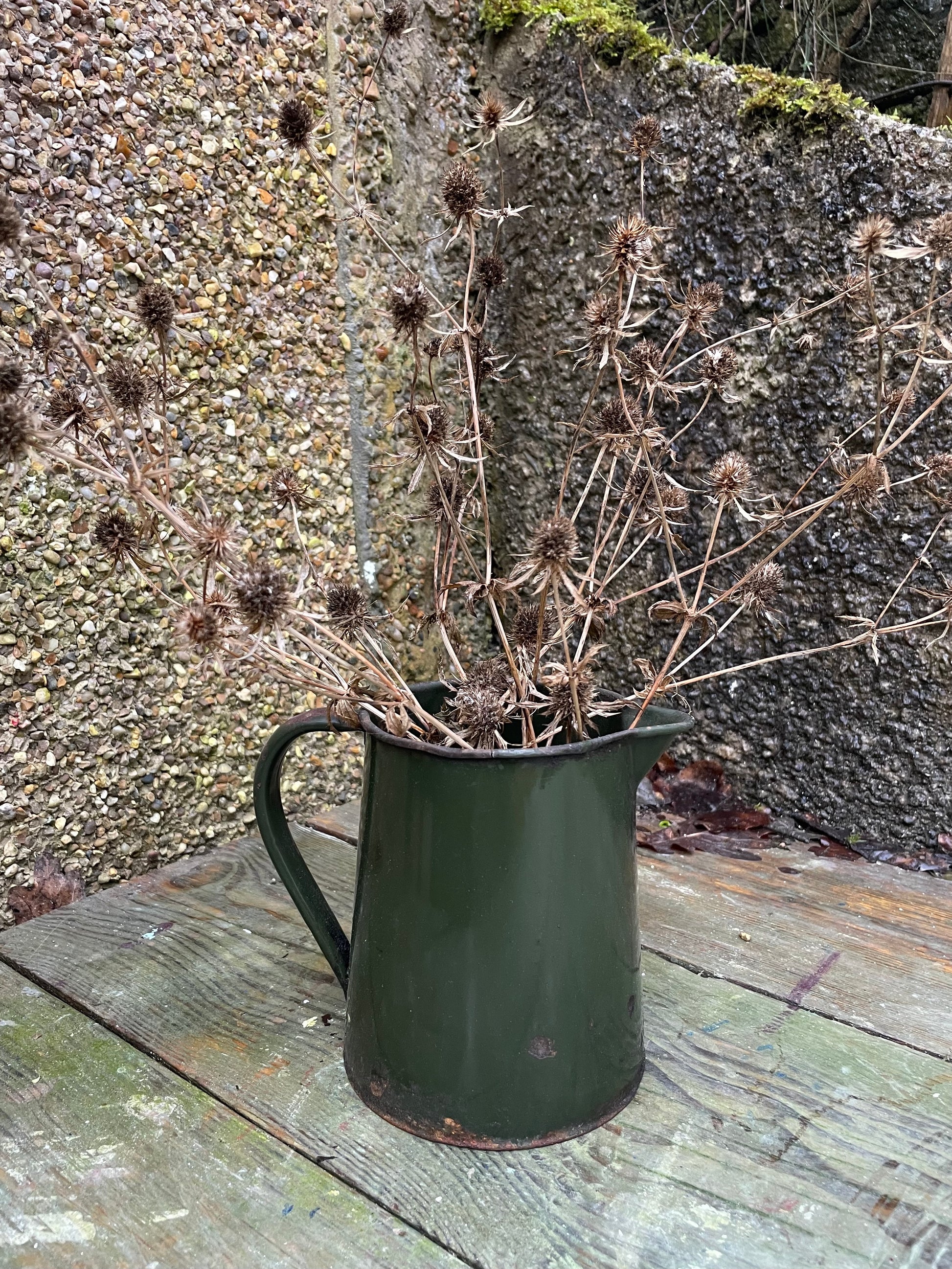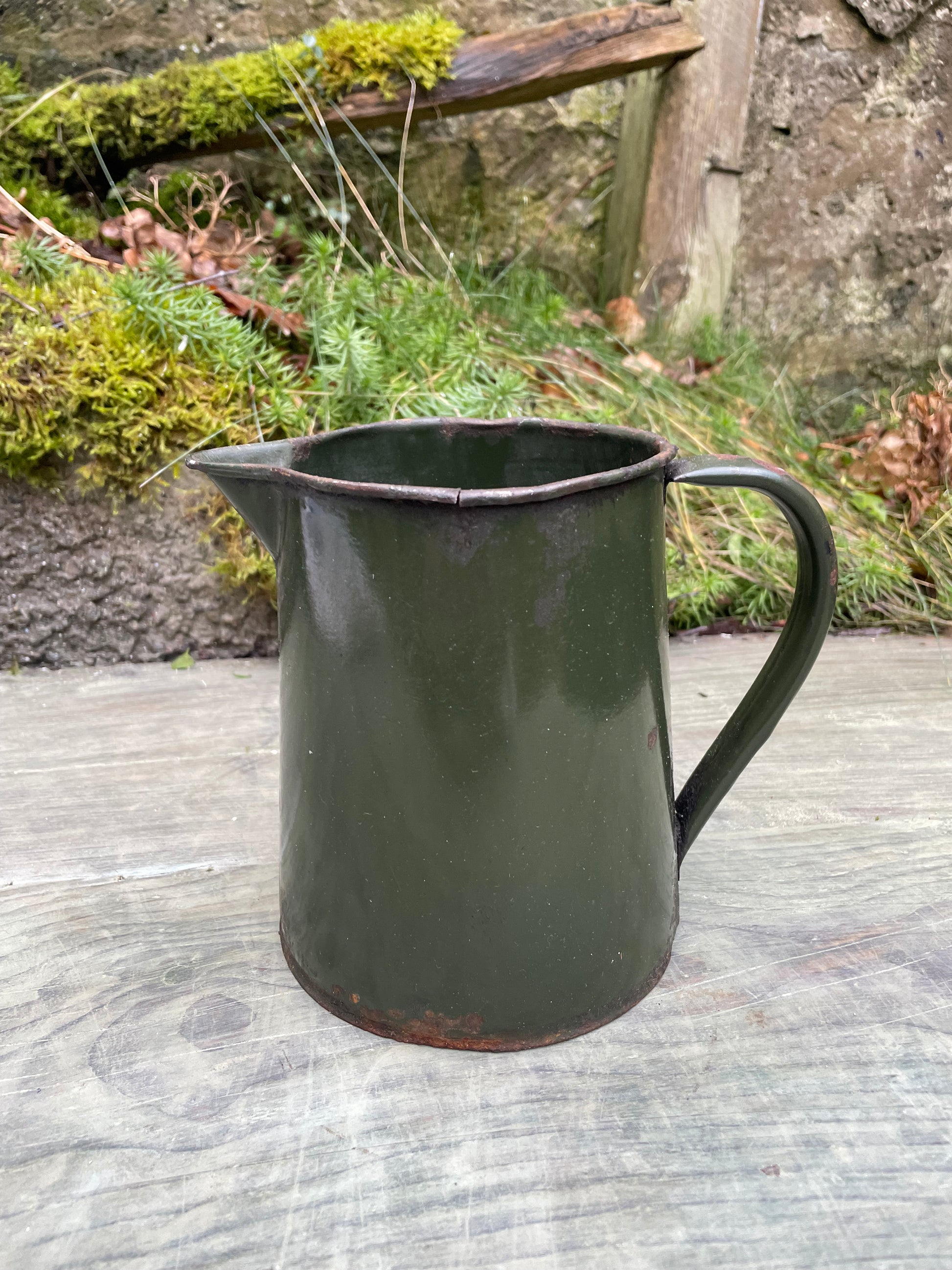 Vintage bottle green enamel jug. Some rust inside and a little on the outside giving it a beautiful patina. Perfect for dried flower display. 16cm high jug base 13cm