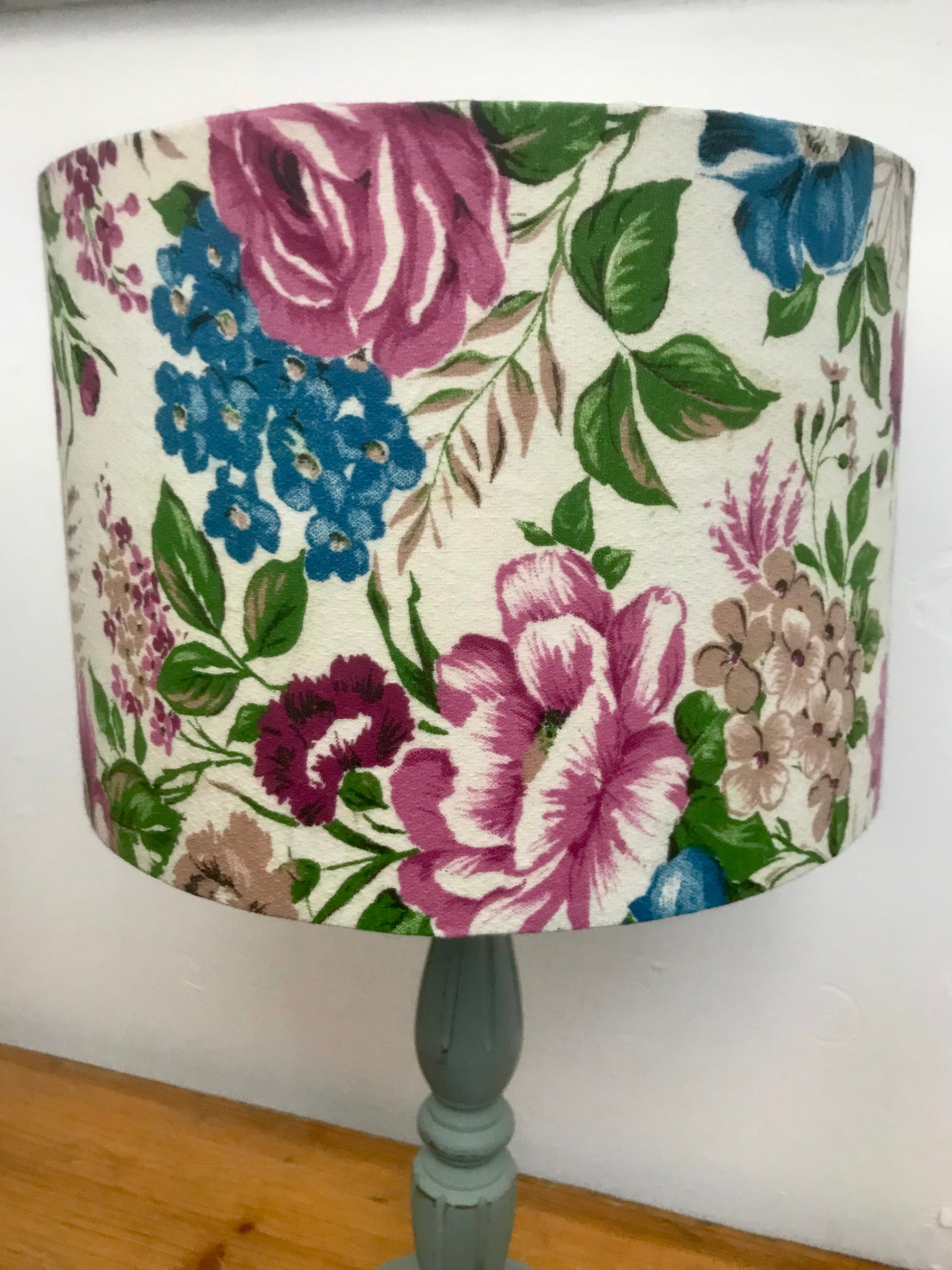 Hand rolled table or standard lampshade in vintage barkcloth 1950’s bright floral fabric