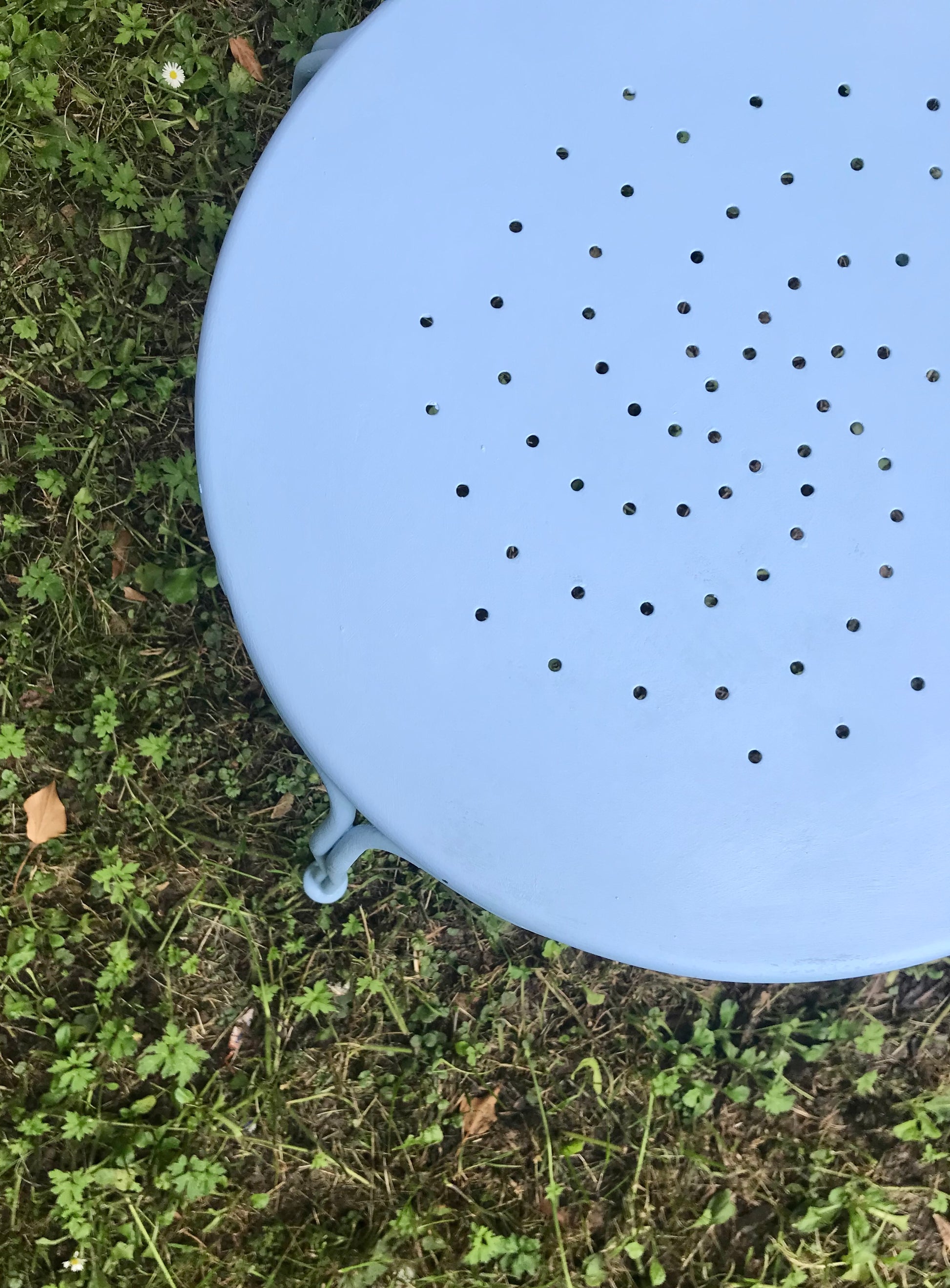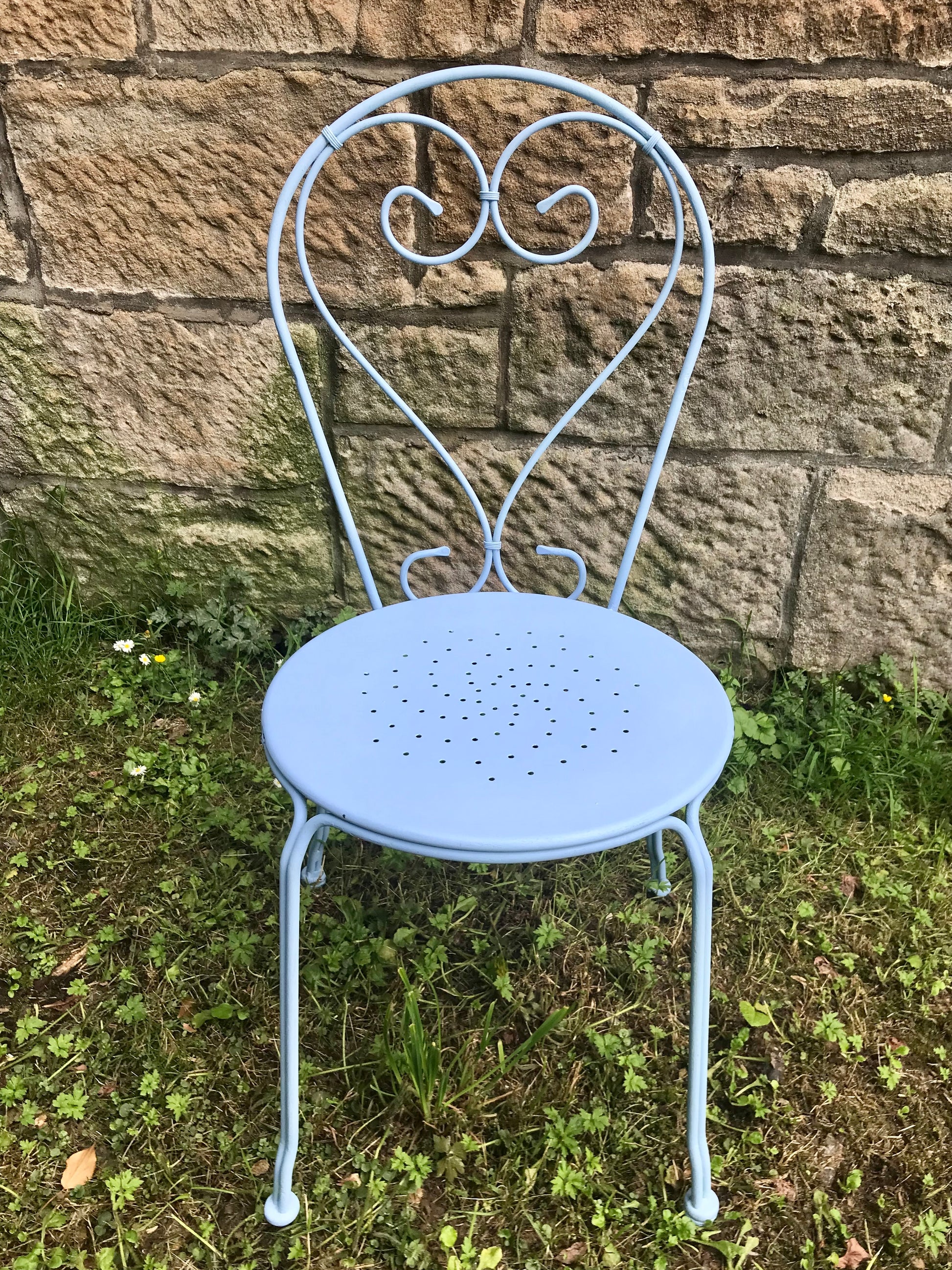 Ornate metal chair painted in pale roundel blue gild lane paint distressed at the edges for a vintage look. Indoor and outdoor use but keep inside during extreme weather!