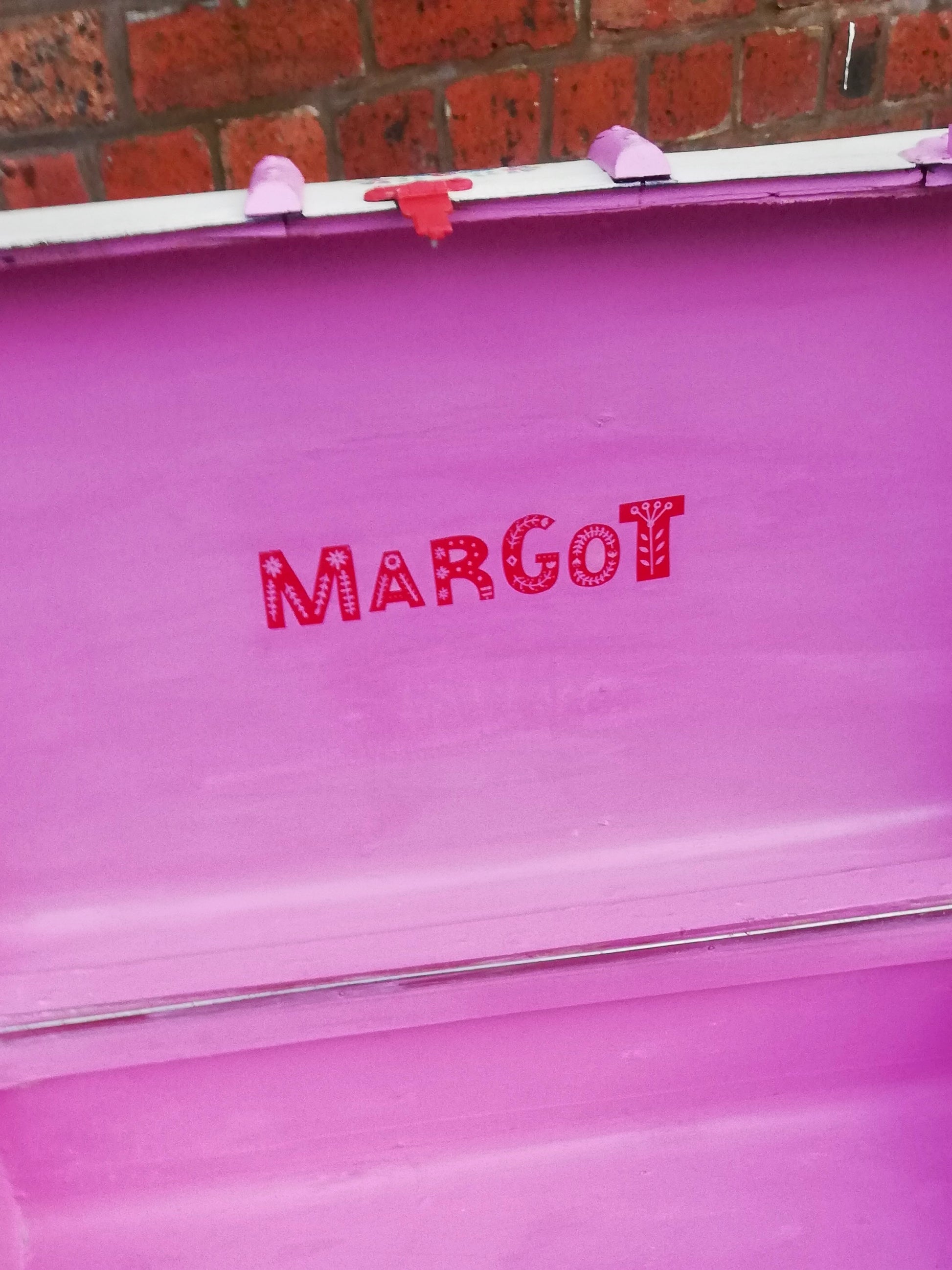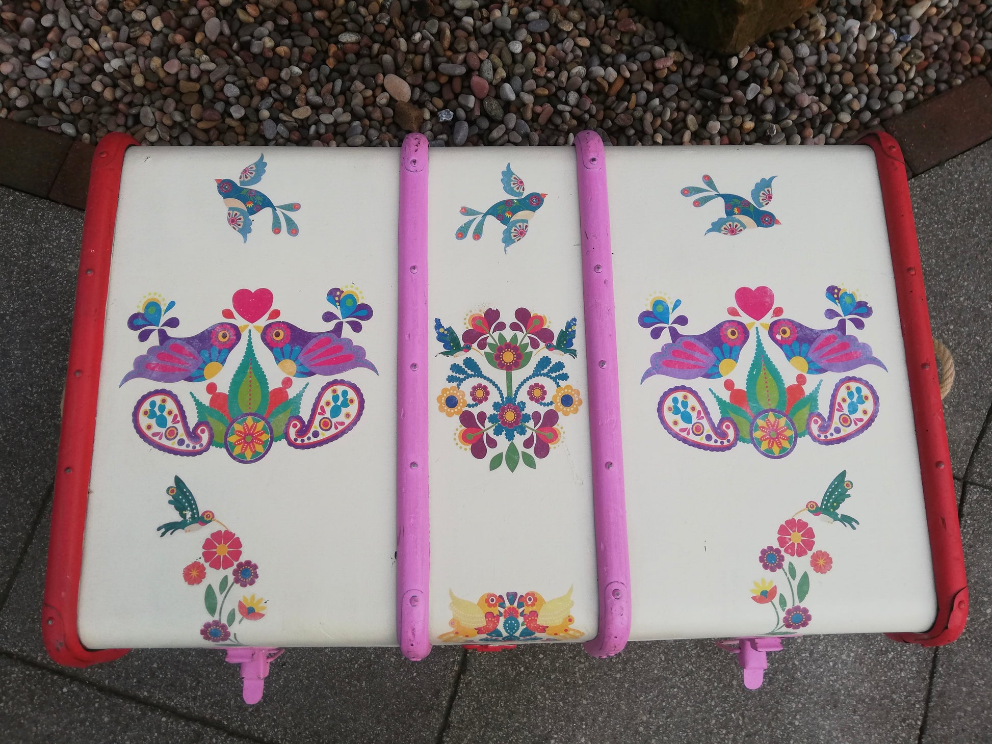 Personalised vintage children's folk art steamer trunk. I use vintage trunks so please contact me to see what I have available. These are usually large coffee table sized trunks. These pieces have a vintage finish the edges and images are sanded back for a vintage look and sealed with a hardwering varnish. You can also choose your colours. I use a transfer process for the images and I can also do any theme you like, so if you'd like something original, please use the bespoke option.