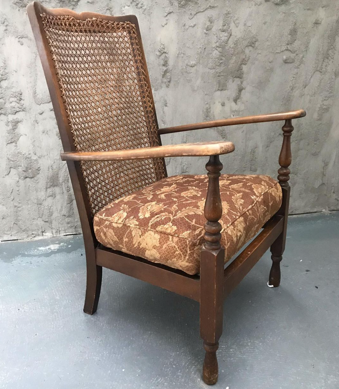 Vintage bedroom/ nursing chair available for refurb/ painting and reupholstery. The Bergere is broken so backrest would be upholstered too. 91cm high x 59.5cm wide x seat height 49 cm. you'd need 2m of fabric of your choice.