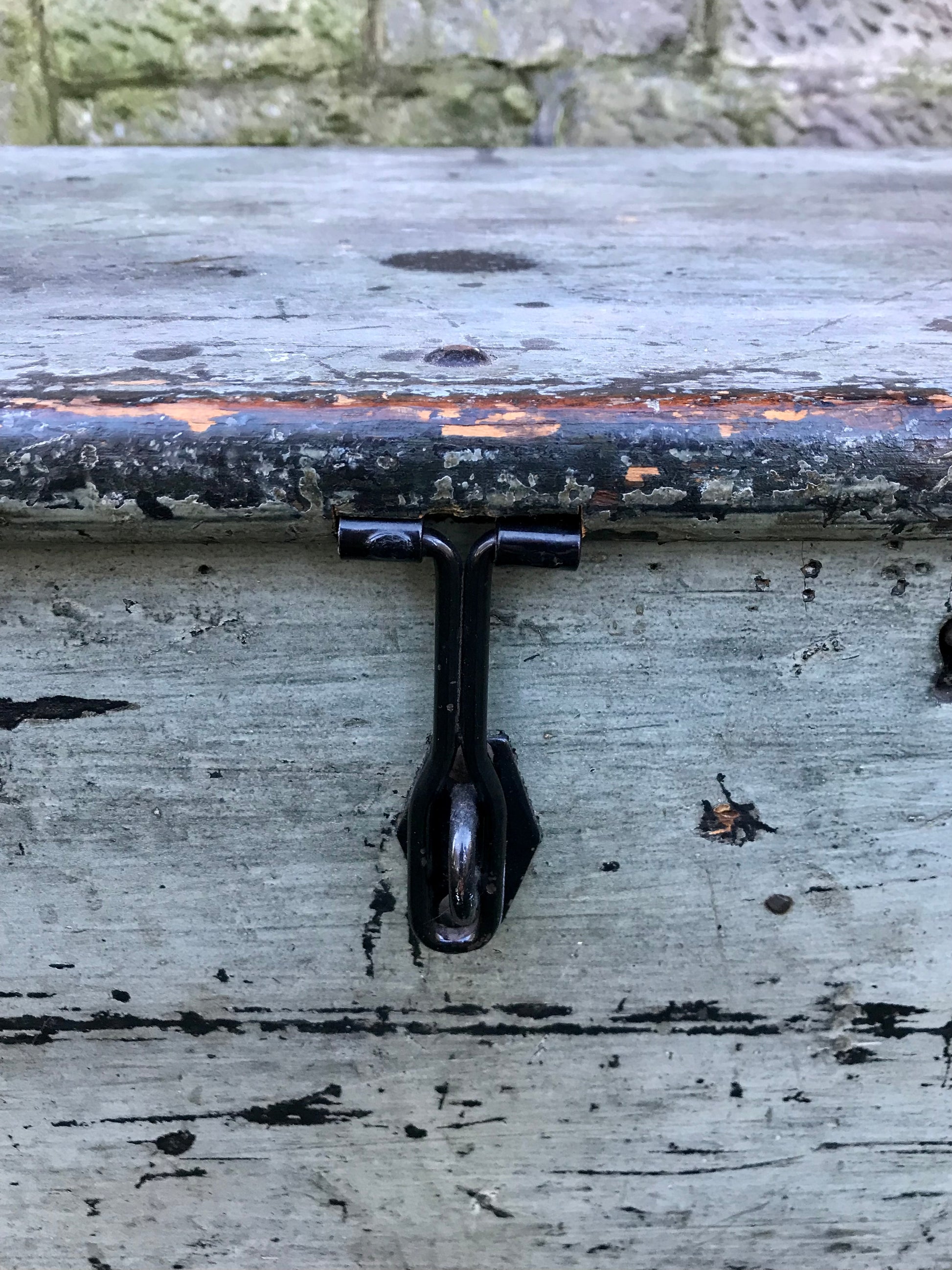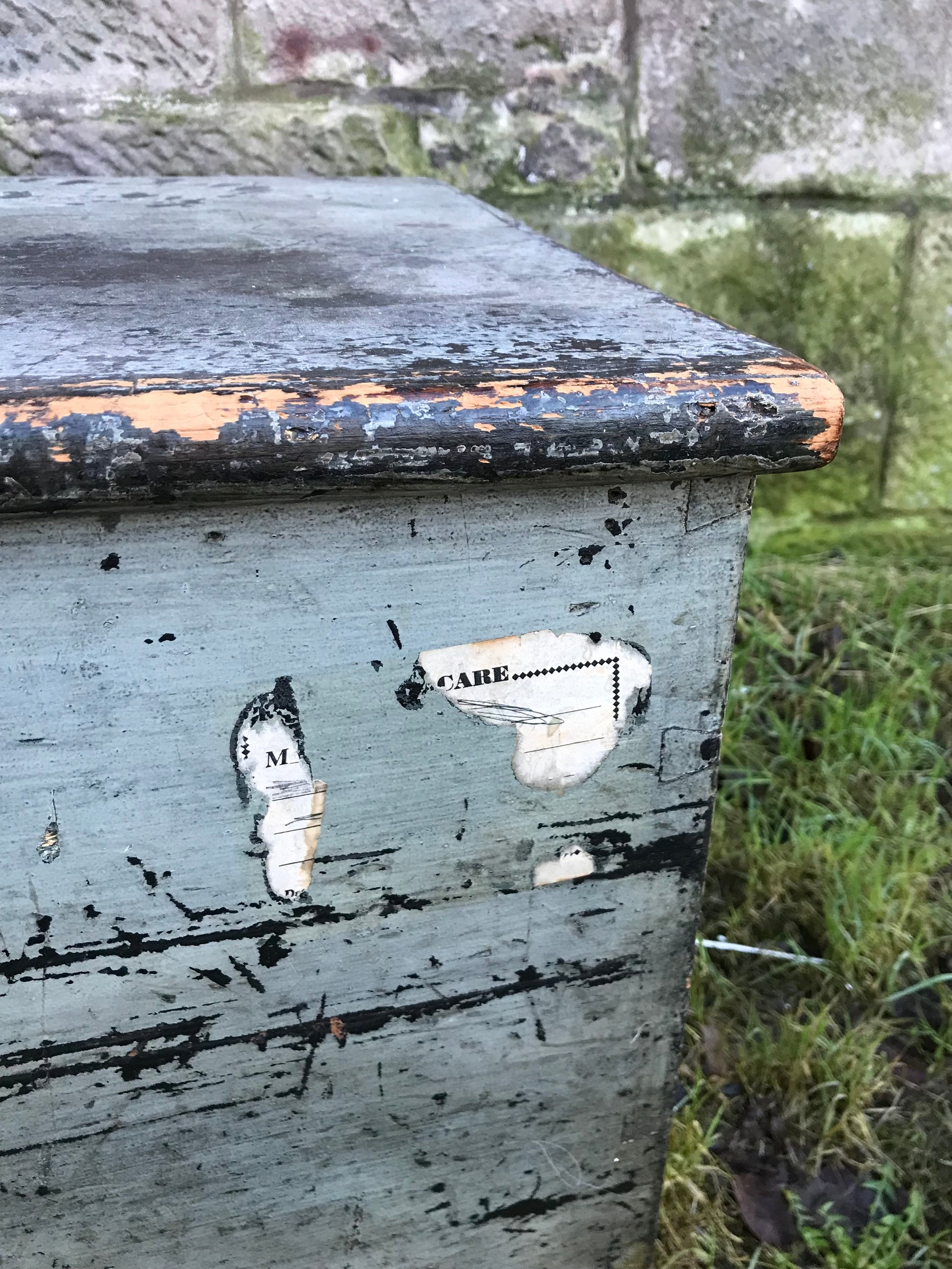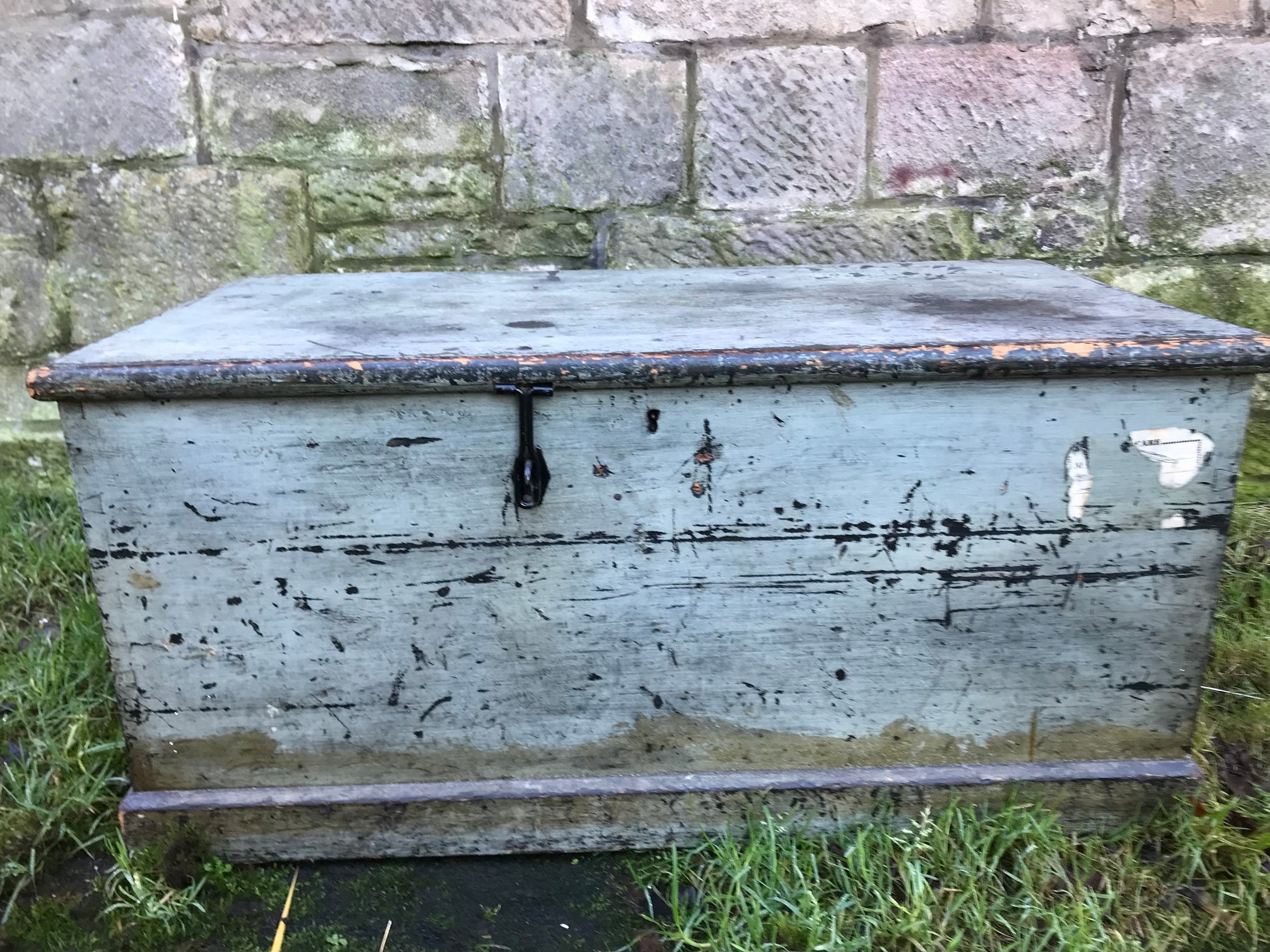 Vintage painted blanket box with original grey/blue chippy paint finish. Raw pitch pine inside. 99cm x 51cm deep x 47cm high.