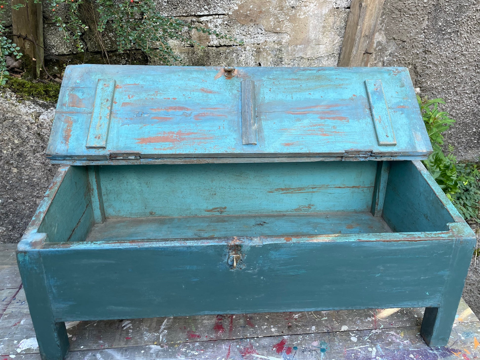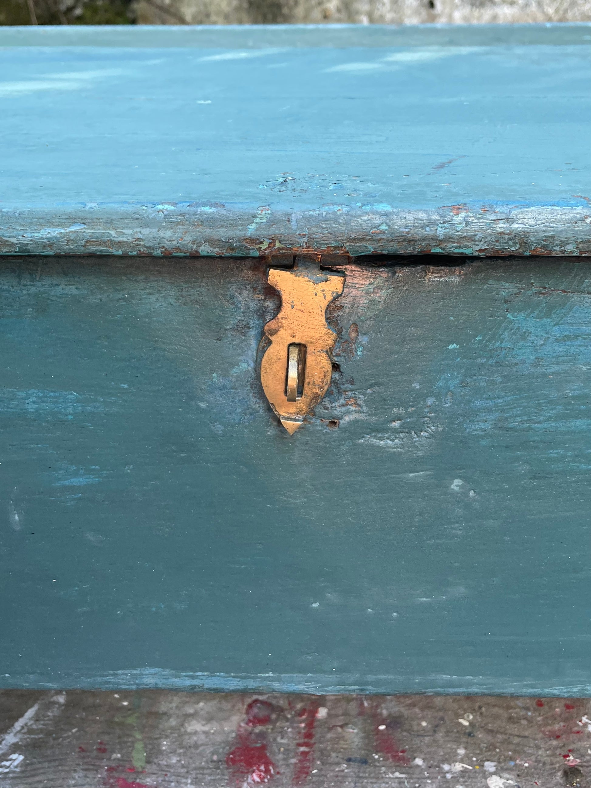 Vintage antique Indian painted storage box / trunk with original blue chippy paint finish. Solid Teak. 1920's 92cm x 44cm deep x 40cm high.