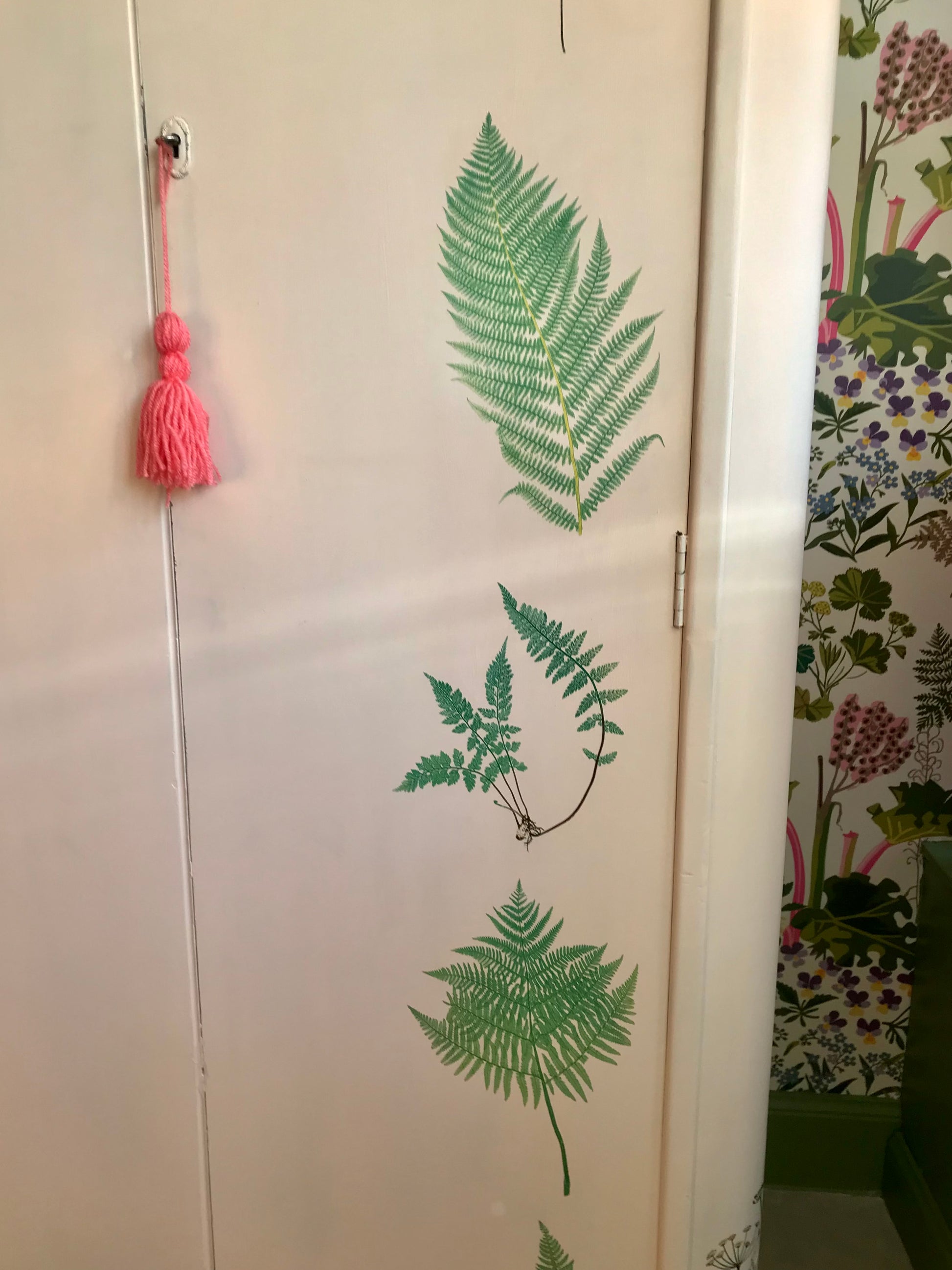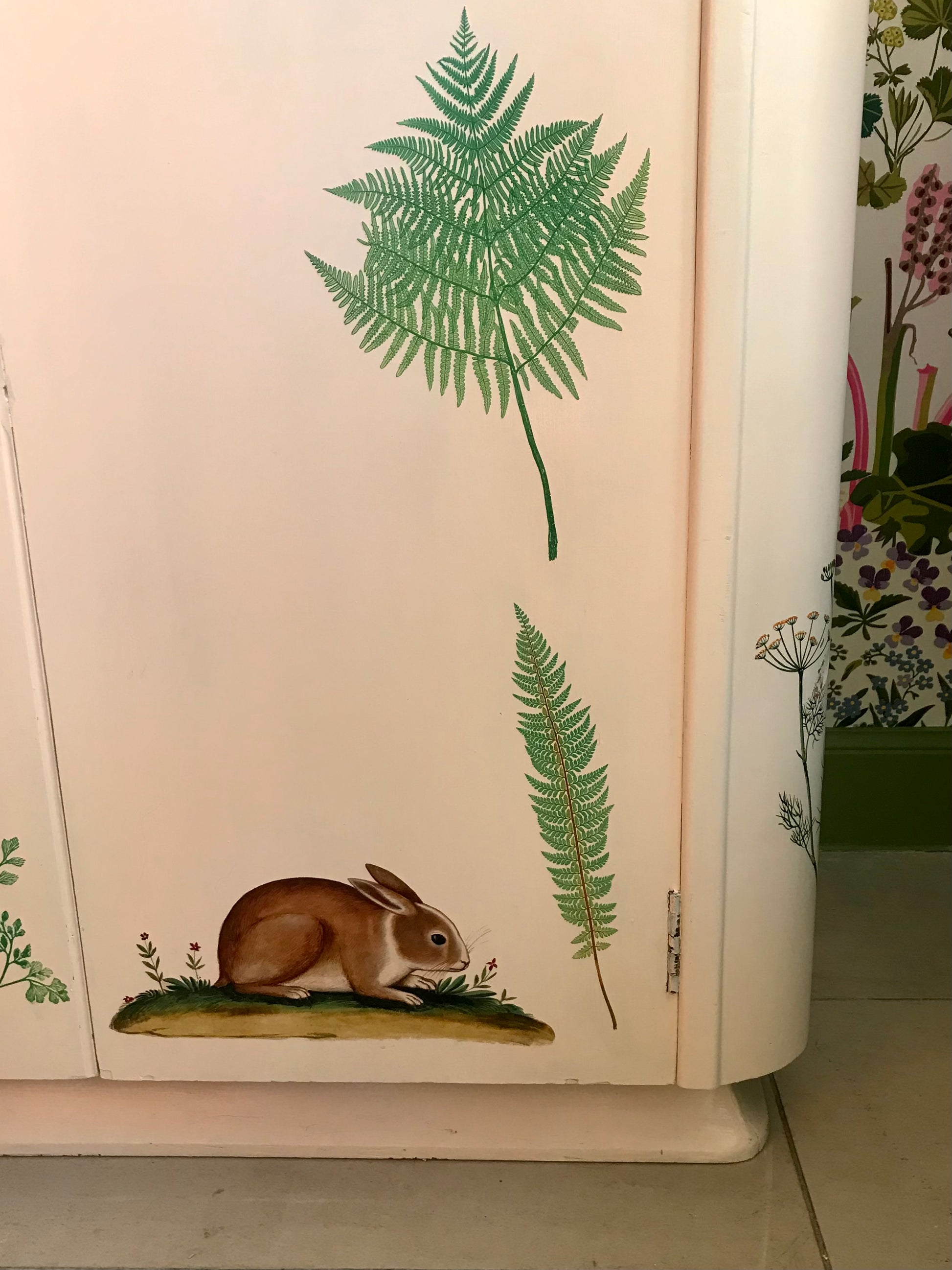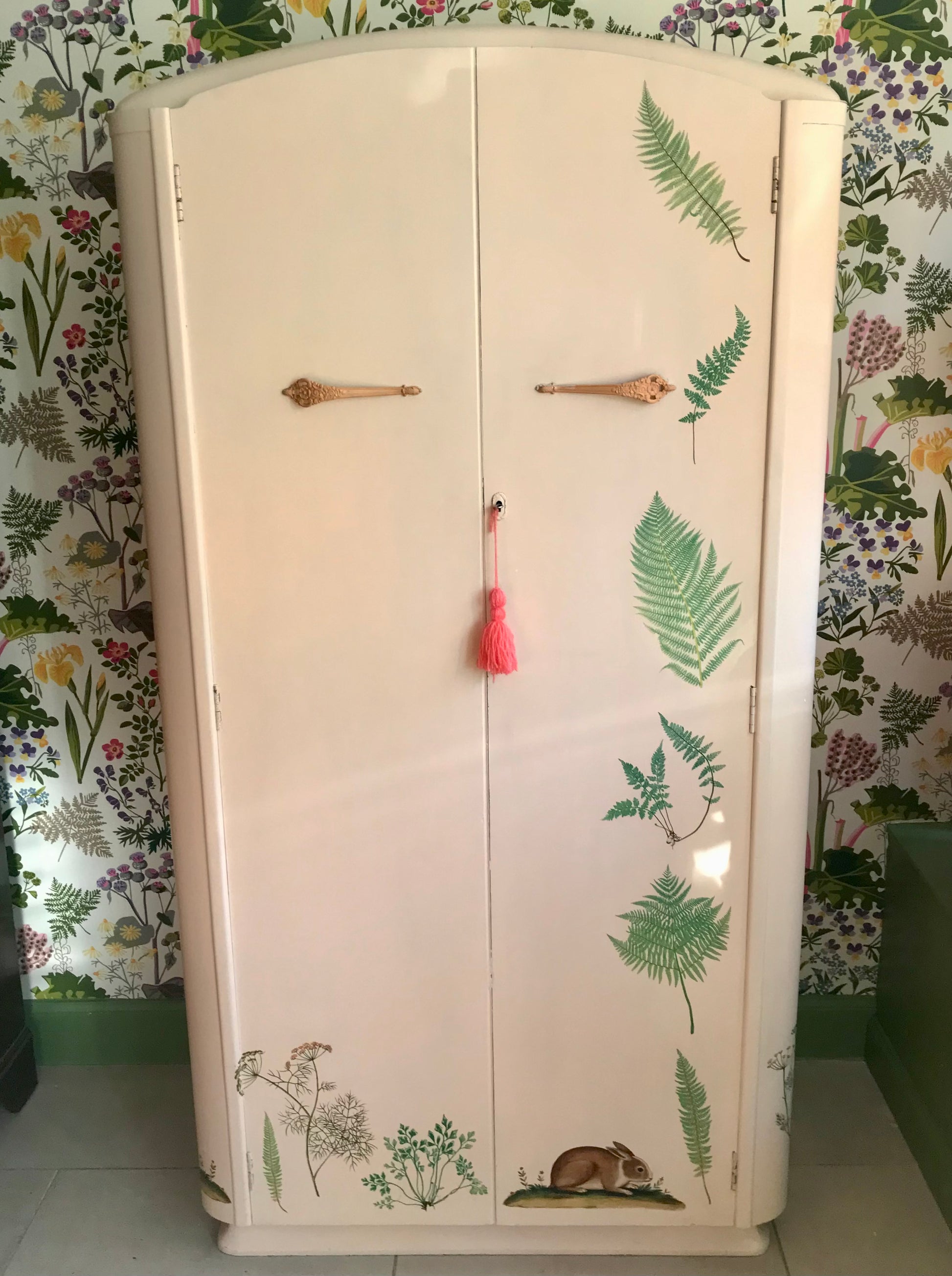 Vintage Art Deco single wardrobe painted in soft peachy apricot with terracotta handles and botanical decals. Inside has been painted a soft green. Edges lightly distressed for a soft vintage look. 177cm high x 99cm wide x 53cm deep.