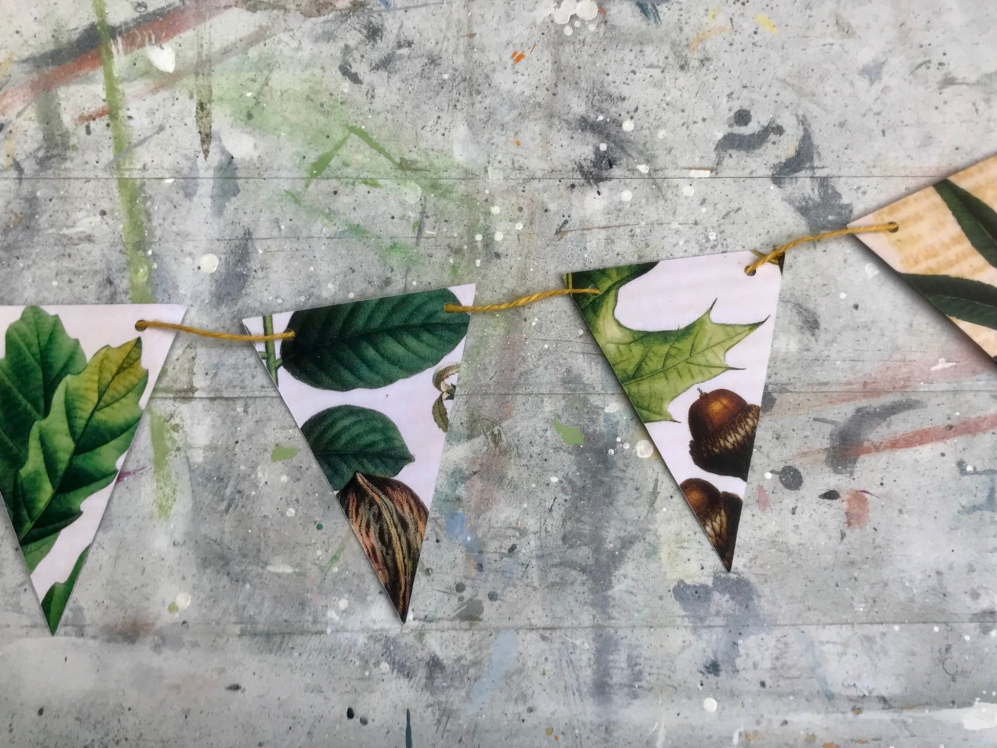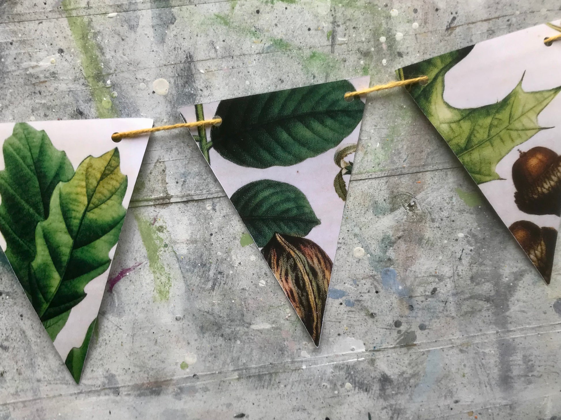Vintage style botanical bunting garland printed on cardstock from original botanical illustrations of leaves . You will receive 12 double sided flags strung on coloured organic twine. Each flag measure 11.5cm wide x 16cm deep and the string is approx 2.14m long. Please message me if you have another theme you would like as I have a huge stock of vintage images . I can also do longer or shorter garlands so please just message me with your request.